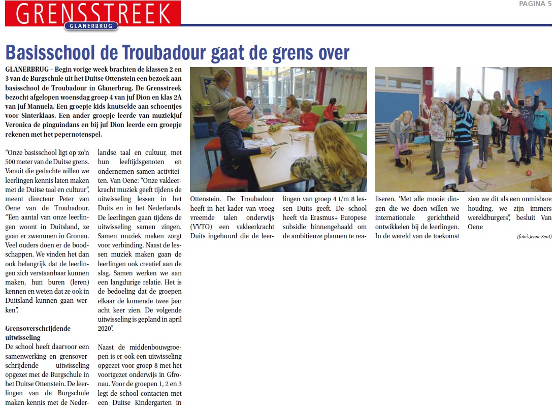 Op basisschool de Troubadour is internationalisering de onderscheidende factor. Glanerbrug is letterlijk groter dan het dorp zelf. In ons onderwijs willen we de wereld naar binnen halen. We werken hierbij samen met een Duitse basisschool, net over de grens, RTV Oost kwam langs om deze prachtige ontwikkeling 'wereldkundig' te maken...!