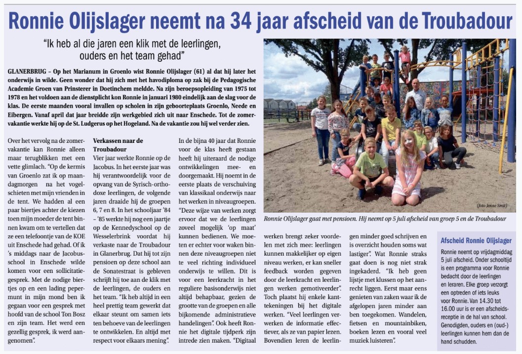 Meneer Ronnie heeft vanwege pensionering afscheid van de Troubadour genomen aan het einde van schooljaar 2018-2019