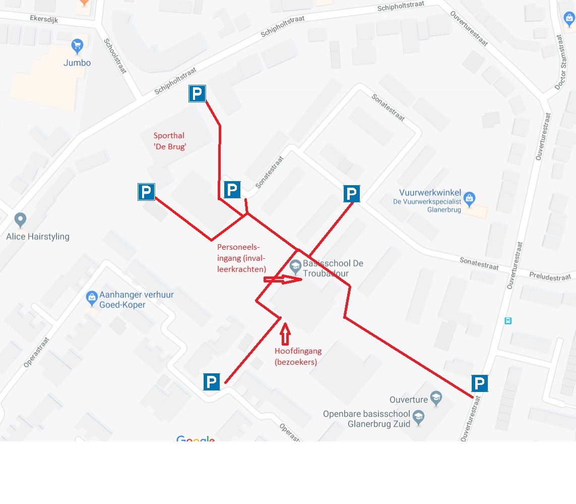 Onze school ligt op een prachtige locatie, midden in de wijk en vlakbij Sporthal 'De Brug'. We realiseren ons goed dat door onze mooie ligging, bezoekers en invalleerkrachten die onze school zoeken, ons niet altijd kunnen vinden en zich afvragen waar ze kunnen parkeren. Op de kaart hieronder geven we aan waar de hoofdingang van ons schoolgebouw is, en waar u het beste kunt parkeren. Invalleerkrachten kunnen tot 8.30u gebruik maken van de personeelsingang. Bezoekers en leveranciers kunnen gebruik maken van de hoofdingang. U kunt zich bij de receptie melden, daar wordt u vervolgens geholpen.